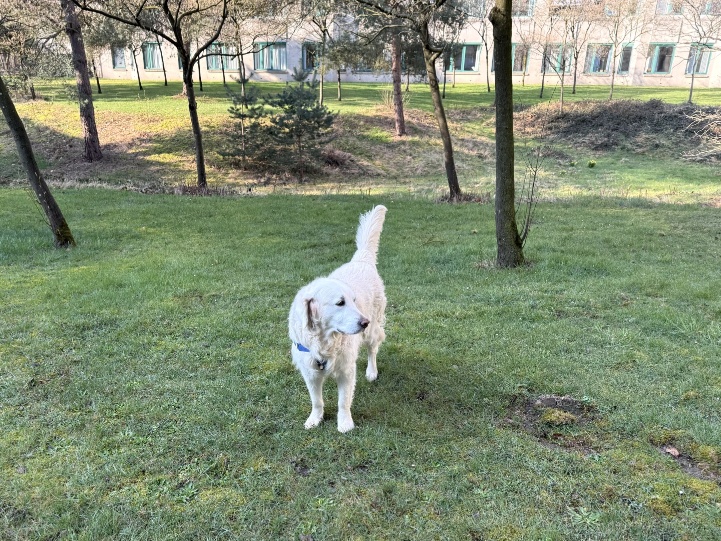 In de middag voelde ik mij alweer een stuk beter. De pijn was weg na een geslaagde ingreep en ik werd steeds opgewekter. Plouf merkte het meteen. Voor het eerst in al die dagen werd ze actief, baldadig zelfs, en begon ze me uit te dagen. Ze wilde wandelen en spelen. Ik zat nog vast aan het infuus dus zo eenvoudig ging dat niet. De medewerkers van de afdeling waren behulpzaam als altijd en we konden even naar buiten, het voorjaarszonnetje in, zodat ze lekker kon rollen op het gras.