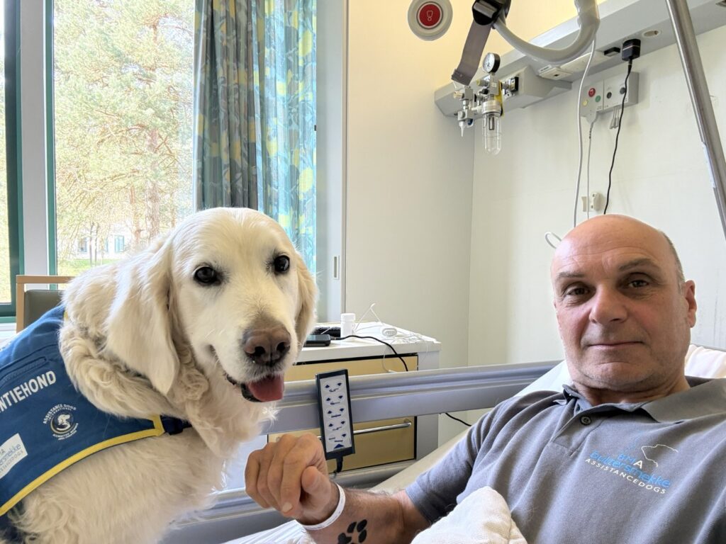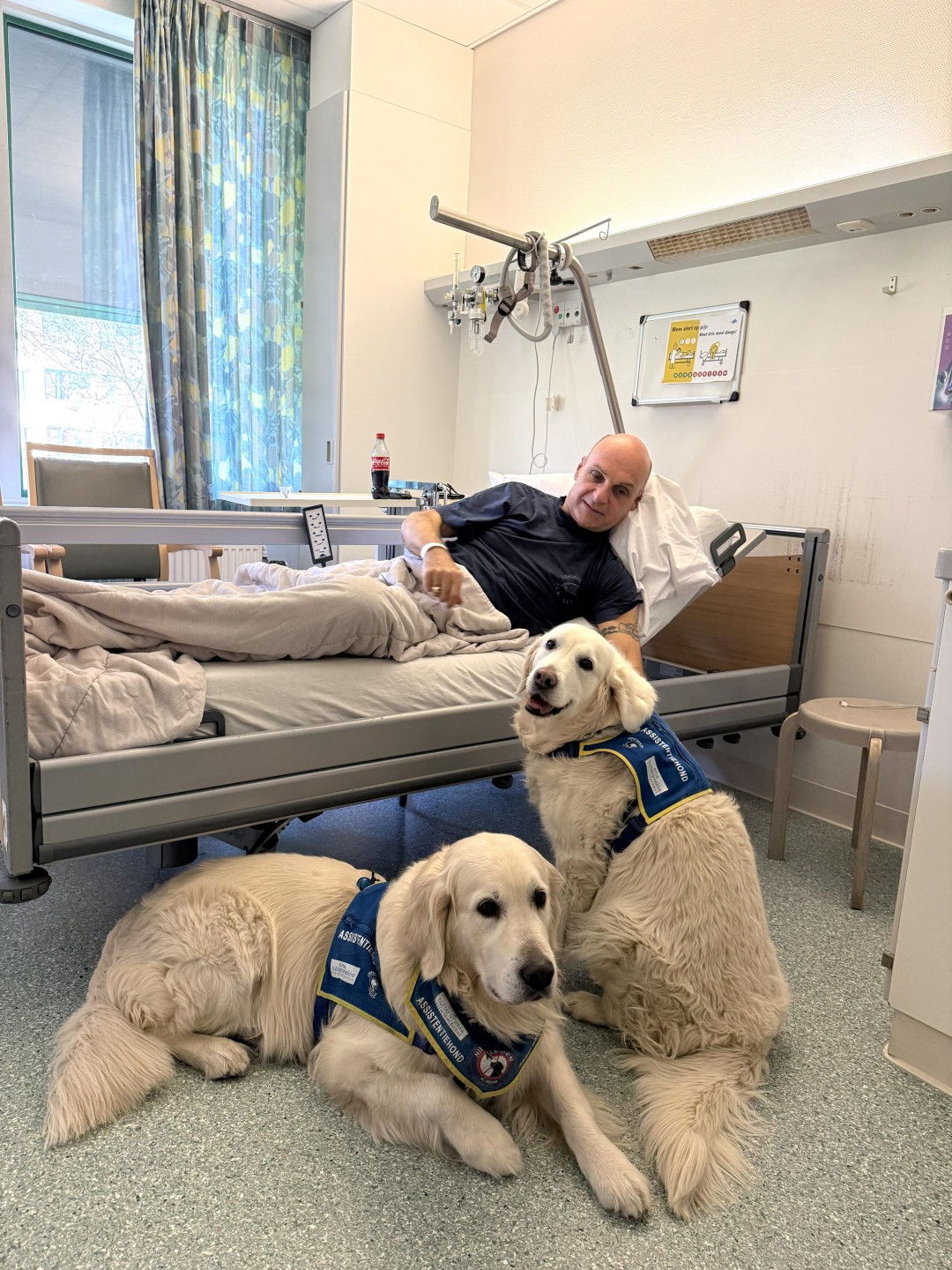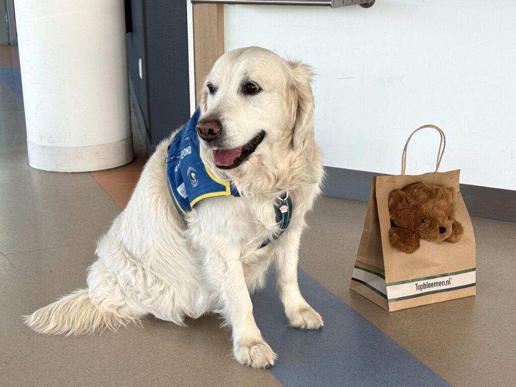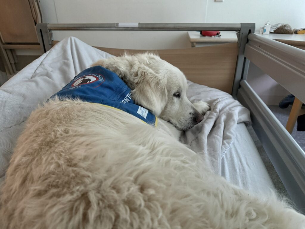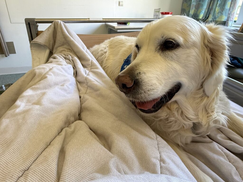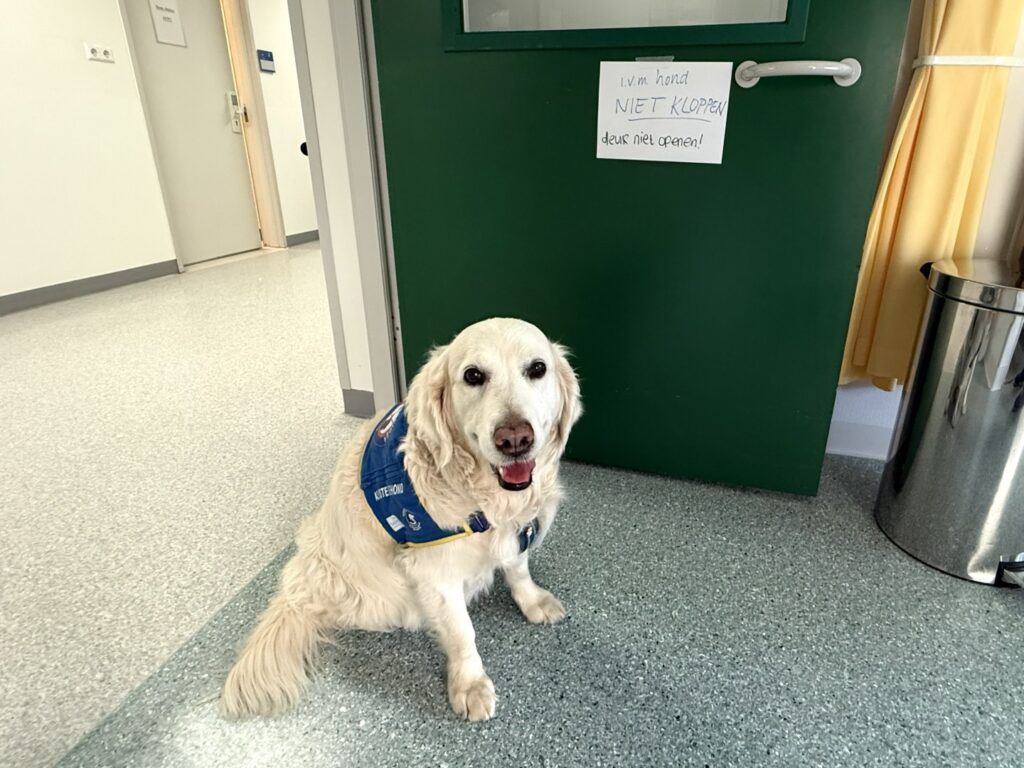 De ontvangst bij de spoedeisende hulp was uitstekend. Plouf was reeds aangemeld en mocht voortdurend bij mij blijven. Er werd vanzelfsprekend wat navraag gedaan over mijn PTSS, met als doel om in te schatten hoe ze mij samen met Plouf het best konden helpen. Na wat eerste onderzoekjes werd ik opgenomen op de verpleegafdeling MDL (maag-, darm- en leverziekten). ‘Het is de eerste keer dat we een hond op de afdeling hebben’ hoorde ik bij aankomst iemand enthousiast zeggen. Plouf volgde mij heel trouw terwijl Chantal haar netjes aan de riem begeleidde.