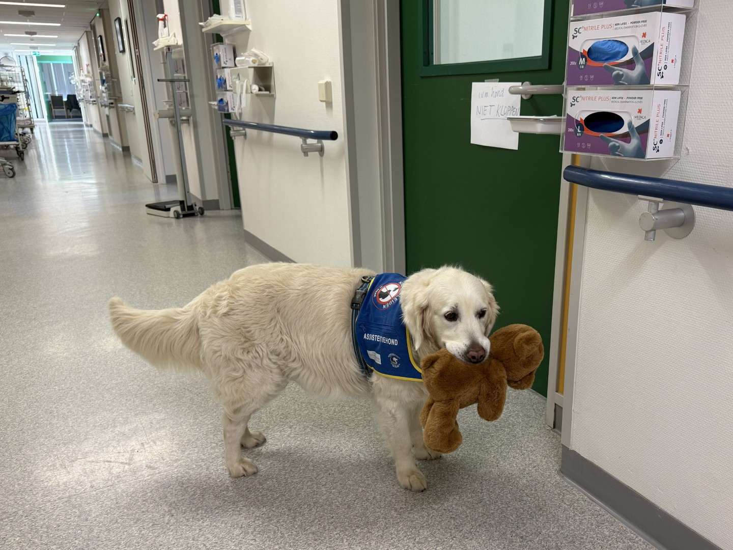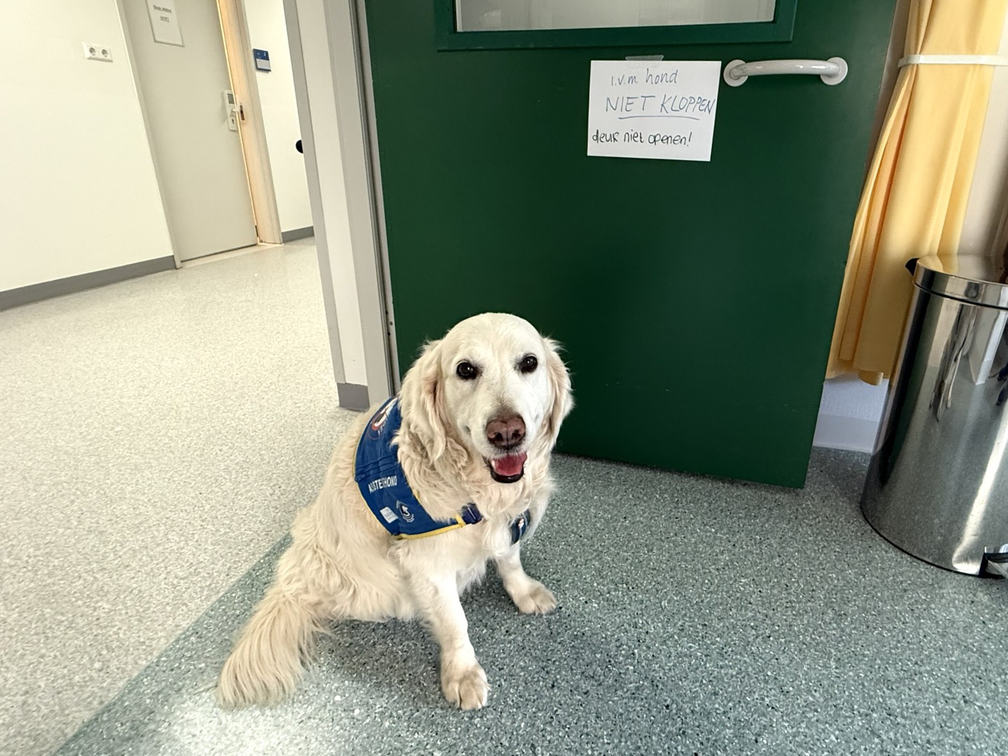 Toen ik naar een MRI-onderzoek moest, kon Plouf vanzelfsprekend niet mee. Ze mocht gewoon op de kamer blijven, terwijl de medewerkers van de afdeling een oogje in het zeil hielden. Plouf vond het niet leuk, maar ze aanvaardde het. Er werd al snel een briefje op de deur geplakt met de tekst ‘In verband met hond NIET KLOPPEN’. Kloppen voordat je ergens binnenkomt is een mooie vorm van beleefdheid, maar Plouf gaat dan blaffen om mij te waarschuwen.